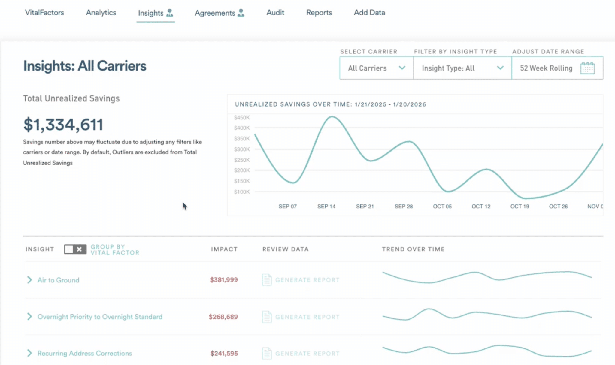 network, quantifies the potential savings, and explains exactly what is happening, why it matters, and what to do next. Instead of digging through reports to find cost issues, shippers get a clear view of unrealized savings opportunities, supporting trend data, and next steps to improve operations.